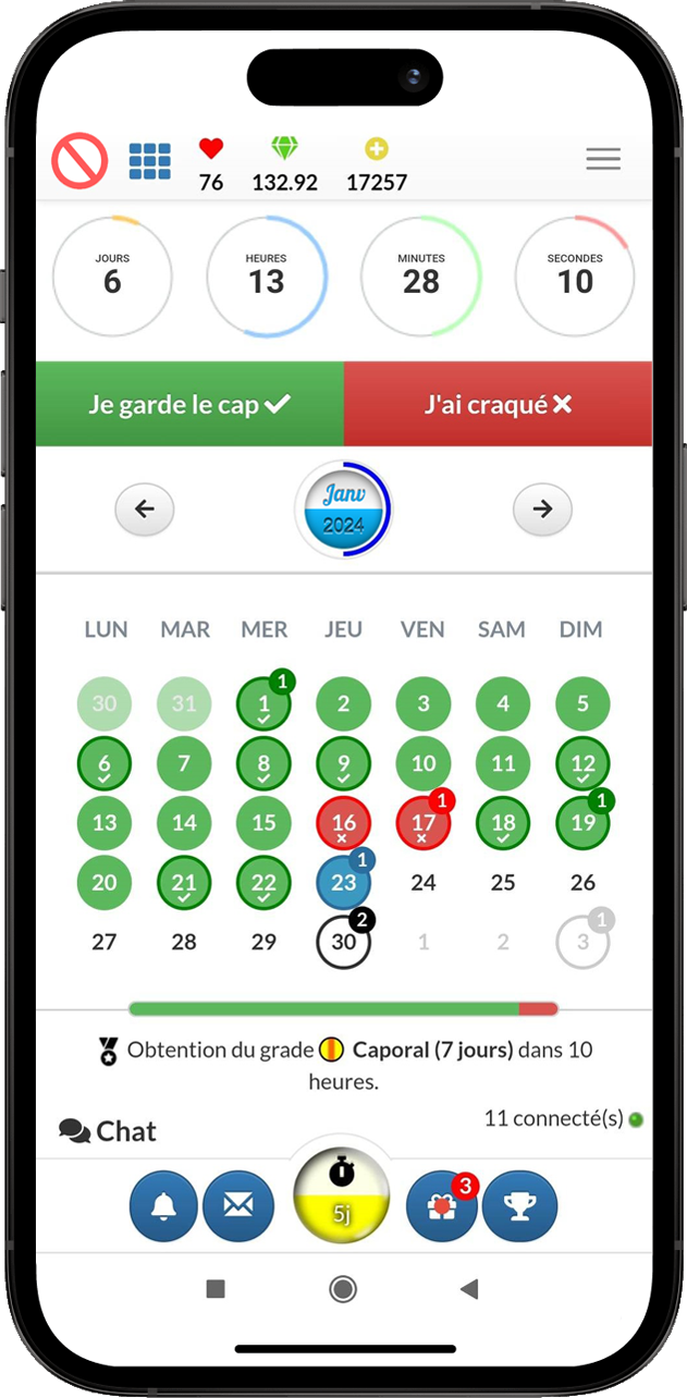 Plus votre compteur de jours d'abstinence augmente, meilleur sera votre grade et votre positionnement dans le classement.